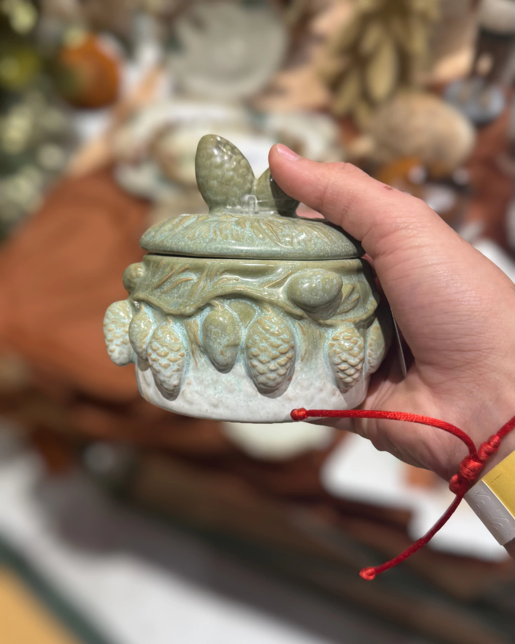 - Pote para mesa posta estilo rústico com detalhes em pinhas
